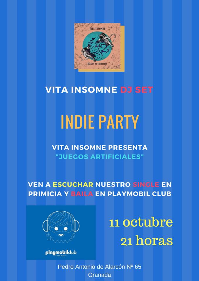 Vita Insomne ha presentado su primer single «Juegos artificiales», adelanto de su segundo ep «Discurso de astronautas» en PlaymobilClub durante una INDIE PARTY a la que ha asistido un numeroso público dispuesto a bailar con el INSOMNE DJ SET.
